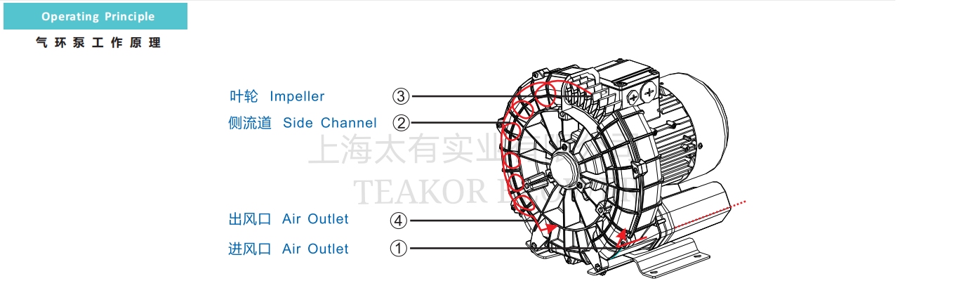 高压风机叶轮直接安装在电机转子上,是完全地无接触压缩。由于泵轴安装在压缩腔外,所以即便工作在最大的压差下,也能确保机械的最大工作可靠性。气体由吸气口1吸入,但它进入侧通道2以后,旋转叶轮3在旋转方向上给气体一个速度同时叶片上离心力使气体向外加速且压力增加。随着旋转的进行,气体的动能增加,使的沿侧通道的气体压力进一步增加。随着侧通道在出口变窄,气体被叶片并通过出口消音QI4排除泵体。
